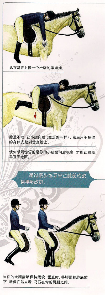 大多數(shù)沒有受訓(xùn)過的騎手坐在馬背上的姿勢就像是坐在椅子上,他的腿在騎坐垂直線前面。錯誤的是,這會讓騎手的動作滯后。要把你的腿放回到正直線上,讓你和馬匹運(yùn)動更致,先用慢步,完成附圖里的練習(xí)。當(dāng)你趴在馬背上時,脖子和盆骨要放松,待會兒,直到你完全地放松下來。找個朋友牽著馬匹慢步,要體會運(yùn)動中所有不同的感覺。