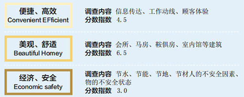 在馬術(shù)俱樂部里,人和馬有著迥異的行為。只有專業(yè)人士在透徹地了解人、馬的行為學(xué)后,并同時(shí)結(jié)合設(shè)計(jì)學(xué)經(jīng)驗(yàn),才能建造出高效、舒適的馬場和俱樂部。這需要深度跨界的專業(yè)知識(shí)。 一、馬術(shù)俱樂部建設(shè)的關(guān)鍵性指標(biāo) 在建造方面,馬術(shù)俱樂部需要考慮六個(gè)關(guān)鍵性指標(biāo):便捷、高效;美觀、舒適;經(jīng)濟(jì)、安全。 我們抽樣調(diào)查了 30 家馬術(shù)俱樂部(其中北京 15 家,外省市 15 家),以 10 分為滿分,取加權(quán)平均值。調(diào)查結(jié)果如下: 可以看出,馬術(shù)俱樂部對(duì)美觀、舒適性的實(shí)現(xiàn)程度最高,而對(duì)經(jīng)濟(jì)及安全性的實(shí)現(xiàn)程度最低。這種現(xiàn)象比較容易解釋:“美觀、舒適”對(duì)設(shè)計(jì)者的專業(yè)能力要求不是很高,而“經(jīng)濟(jì)、安全”卻需要對(duì)人和馬的行為有非常透徹的研究后才可以做到。 二、馬術(shù)俱樂部的主要建筑分區(qū)構(gòu)成 一個(gè)馬術(shù)俱樂部可大致分為前場(經(jīng)營接待區(qū))、中場(訓(xùn)練比賽、養(yǎng)殖區(qū))和后場(功能管理區(qū))。