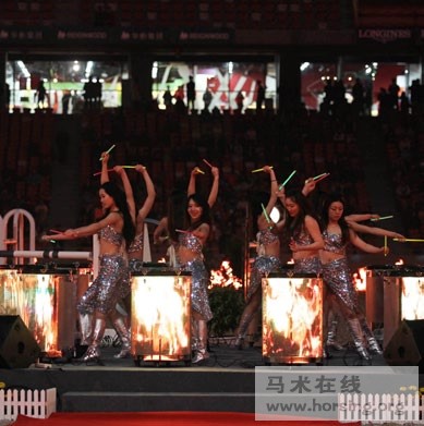 一種集聲、光、水景為一體的現(xiàn)代打擊樂器——水鼓,為大師賽造勢,在鳥巢華麗麗地上演了。激昂的樂曲,鼓動的節(jié)奏,激情四濺的水花,優(yōu)美婀娜的舞姿,魅力無限的燈光頻閃效果,演繹出燦爛振奮的舞風(fēng)和鼓韻,帶給了觀眾目不暇接的視覺沖擊和審美享受。