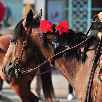 在馬文化節(jié)的馬隊(duì)巡游活動(dòng)中,不光各國騎手身著特色服飾,連馬兒也得精心打扮。鮮紅的花朵裝飾在梳成小辮兒的鬃毛間,煞是好看。