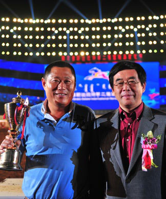 中國馬協(xié)主席潘志琛為青島寶湖馬術(shù)俱樂部董事長于瑞宗頒發(fā)“最佳馬主”獎(jiǎng)杯。寶湖馬術(shù)俱樂部在國內(nèi)首家引進(jìn)夸特馬胚胎移植技術(shù),不依靠純進(jìn)口,自行繁育純種夸特馬。