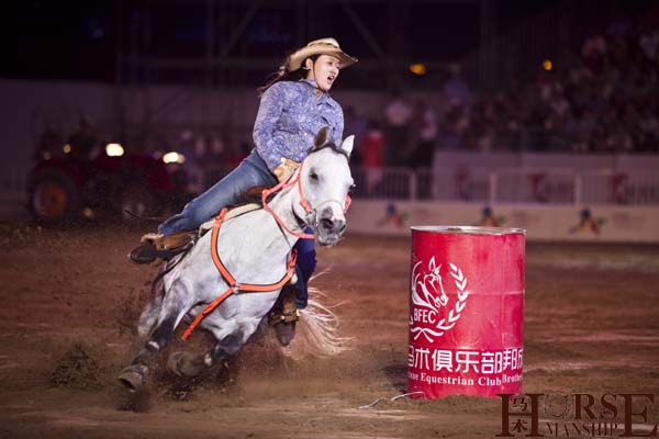 2012 年8 月10 日晚8 點,鄂爾多斯,達(dá)拉特國際繞桶大獎賽康巴什站。她戴上手套,跨坐于馬背上,腰帶上的巴扣絢麗奪目,銀色的耳飾折射出比賽夜場耀眼的燈光,此時興奮的“神槍手”不斷用前肢刨著地,鼻息粗重。